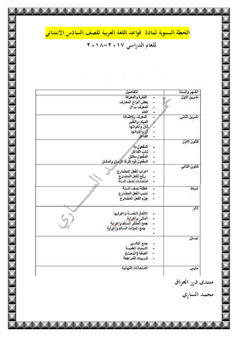 الخطة السنوية لمادة اللغة العربية للصف السادس الأبتدائي للعام 2018 شبكة طلابنا لخدمة الطالب العراقي