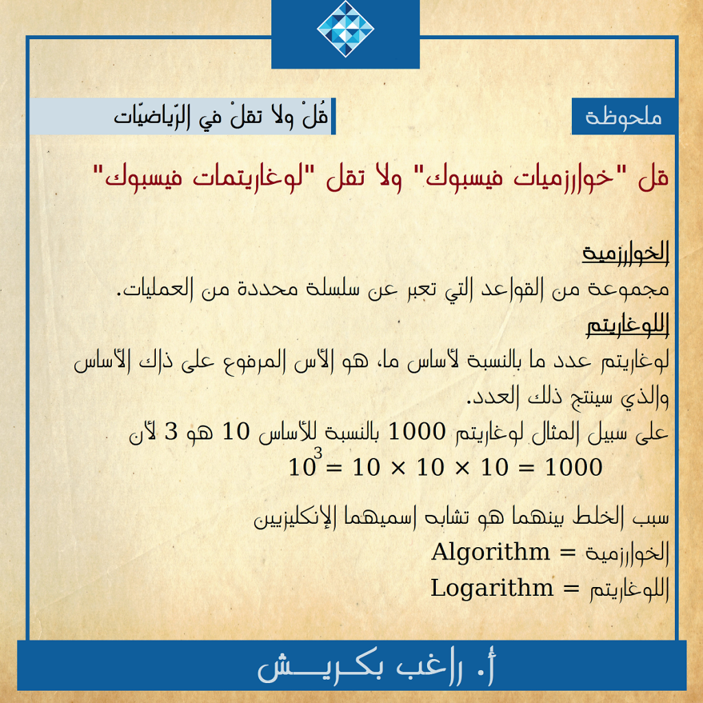 لماذا في الرياضيات يقولون اللوغاريتمات بدل الخوارزميات مع ان اللوغاريتم ترجمة ل كلمه خوارزم