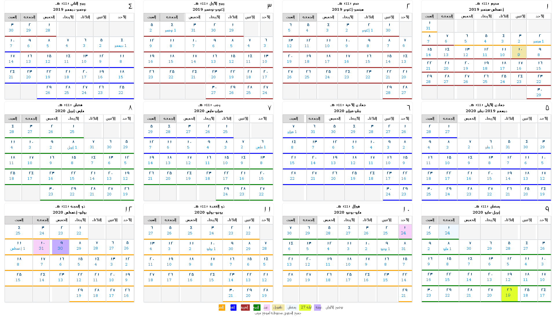 تقويم الهجري 1441 التقويم الهجري والميلادي 2020 مع المناسبات الاسلامية وتاريخ اليوم بالهجري والميلادي 1441 هـ
