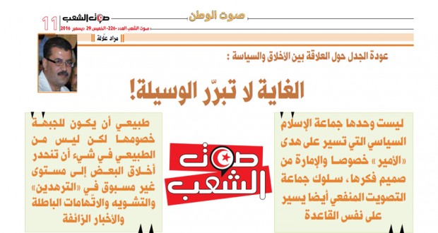 عبارة طالما سمعناها ت ردد في الأبحاث وفي الأقوال حتى أصبحت كأنها مسلمة لدى العام والخاص. الغاية تبرر الوسيلة. قبل حوالي عشرين عاما كتبت مقالا بعنوان هل الغاية تبرر الوسيلة ونفيت فيه نفيا قاطعا أن تكون الغاية مبررة للوسيلة واستشهدت فيه بكلام لسيد قطب يفيد. فقد قيدت الخدعة في حالة الحرب فاعتبرت حالة استثنائية لا تصح إلا بموجب الحرب.