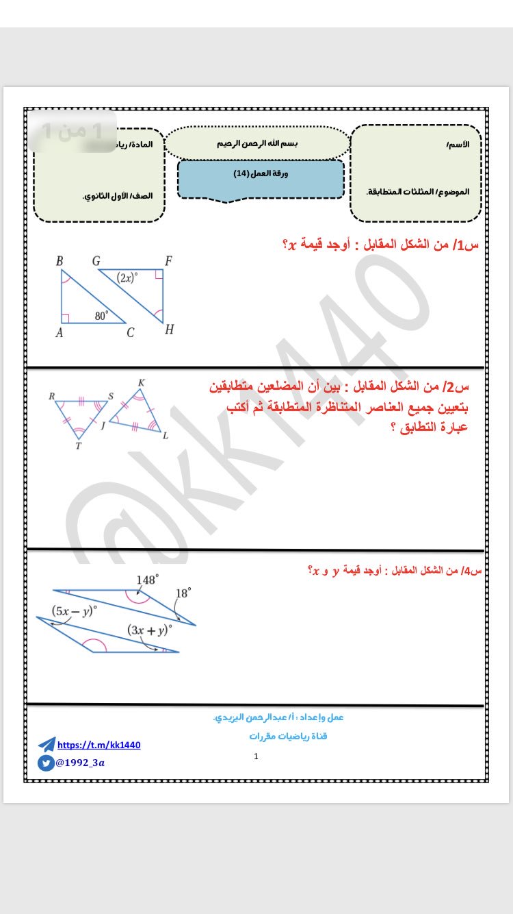 المثلثات المتطابقة اول ثانوي