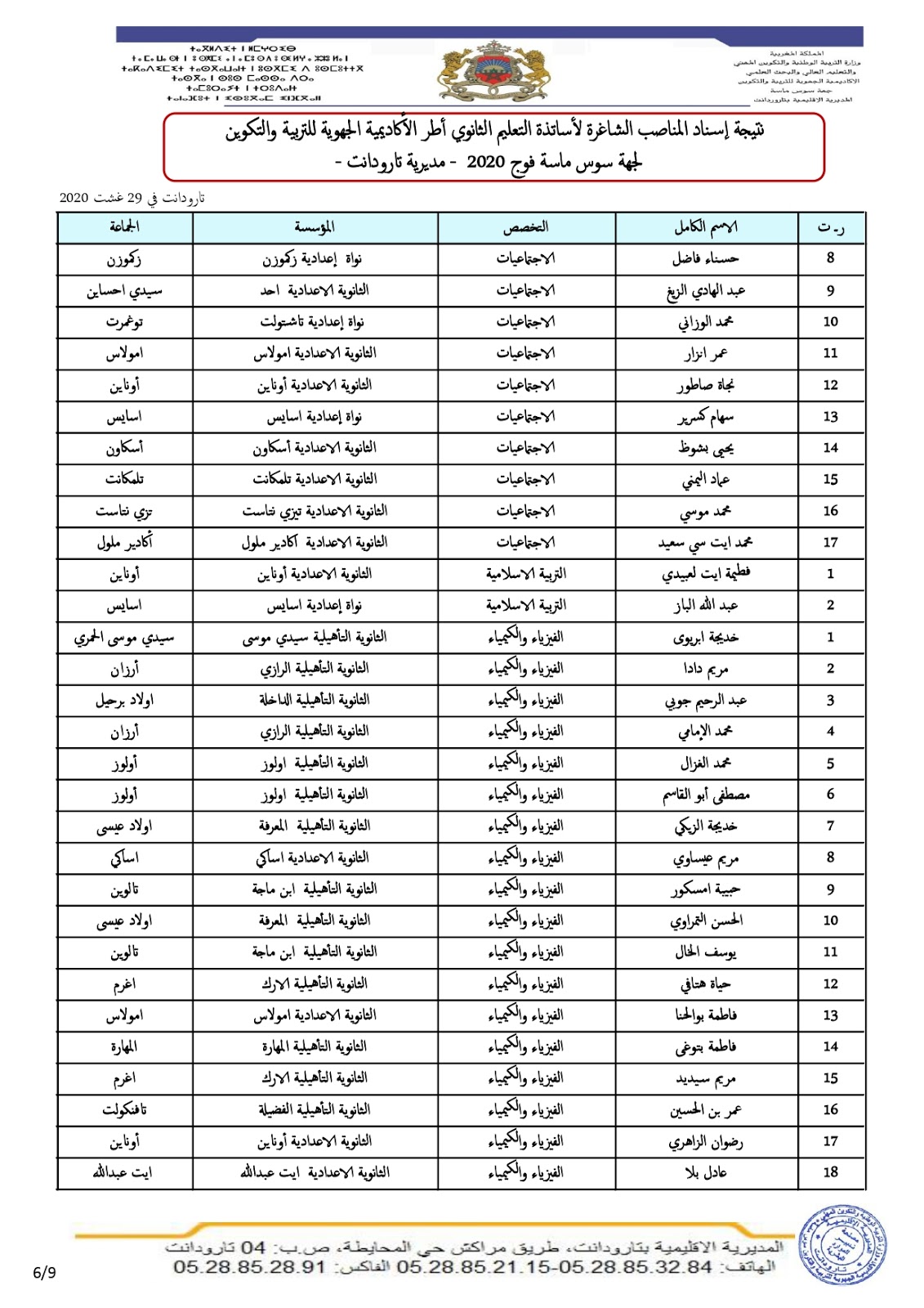 مديرية تارودانت نتائج تعيينات الأساتذة أطر الأكاديمية السلك الابتدائي والثانوي 2020