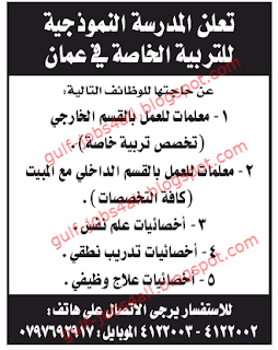 وظائف المدرسة النموذجية للتربية الخاصة في عمان مطلوب معلمات واخصائيات كافة التخصصات منشور يناير 2017