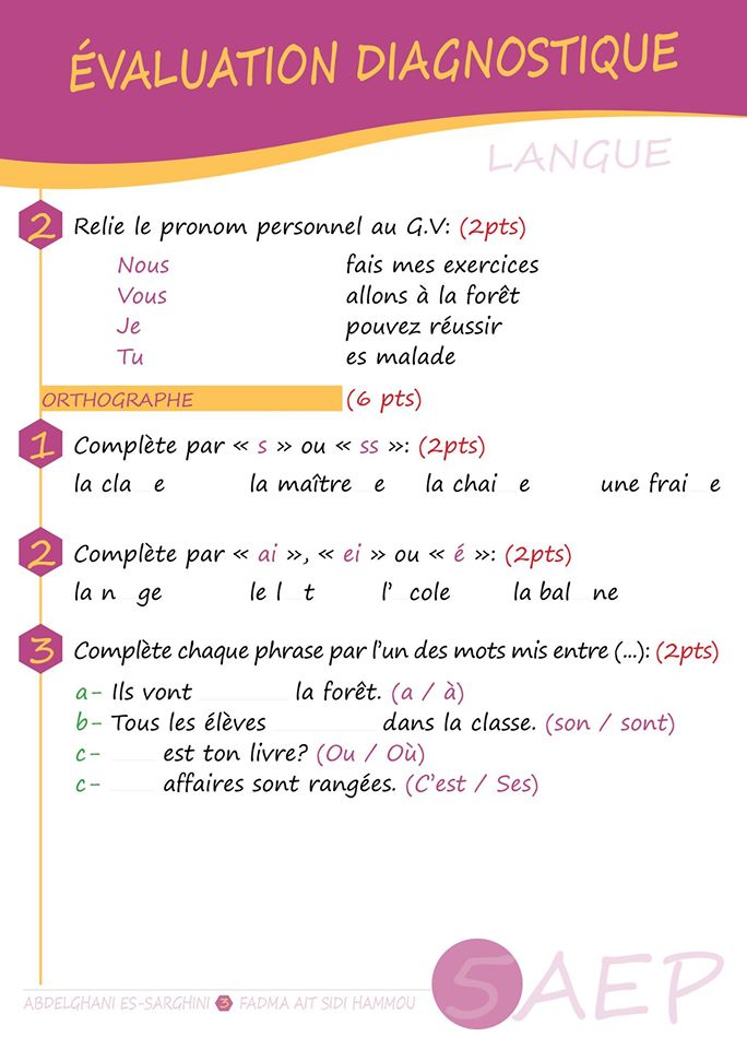 التقويم التشخيصي مادة اللغة الفرنسية الخامس ابتدائي