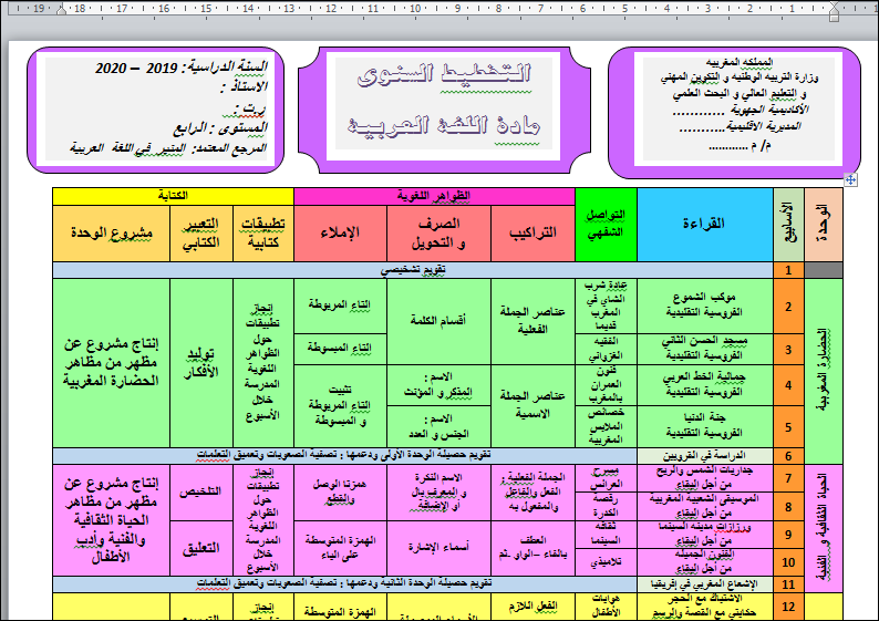 التخطيط السنوي مرجع المنير في اللغة العربية المستوى الرابع ابتدائي