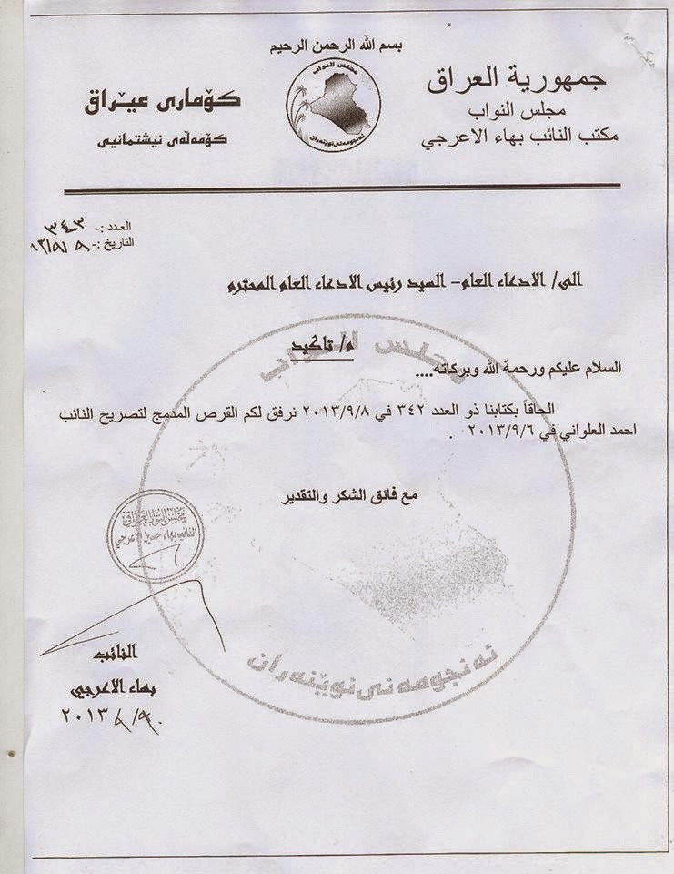 القضاء يصدر مذكرة إعتقال بحق العلواني بناءا على طلب السي د الأعرجي السيد بهاء الأعرجي الموقع الرسمي