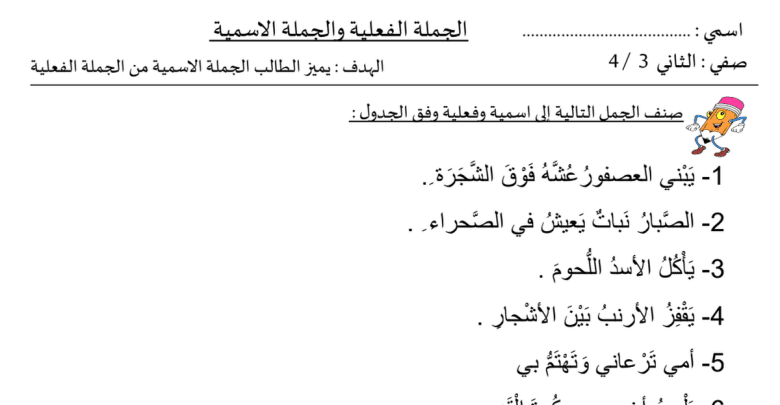 اللغة العربية ورقة عمل الجملة الإسمية والجملة الفعلية للصف الثالث ملفاتي