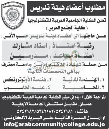 تعلن الكلية الجامعية العربية للتكنولوجيا كلية المجتمع العربي سابقا عن وظائف شاغرة للجامعيين في التخصصات التالية