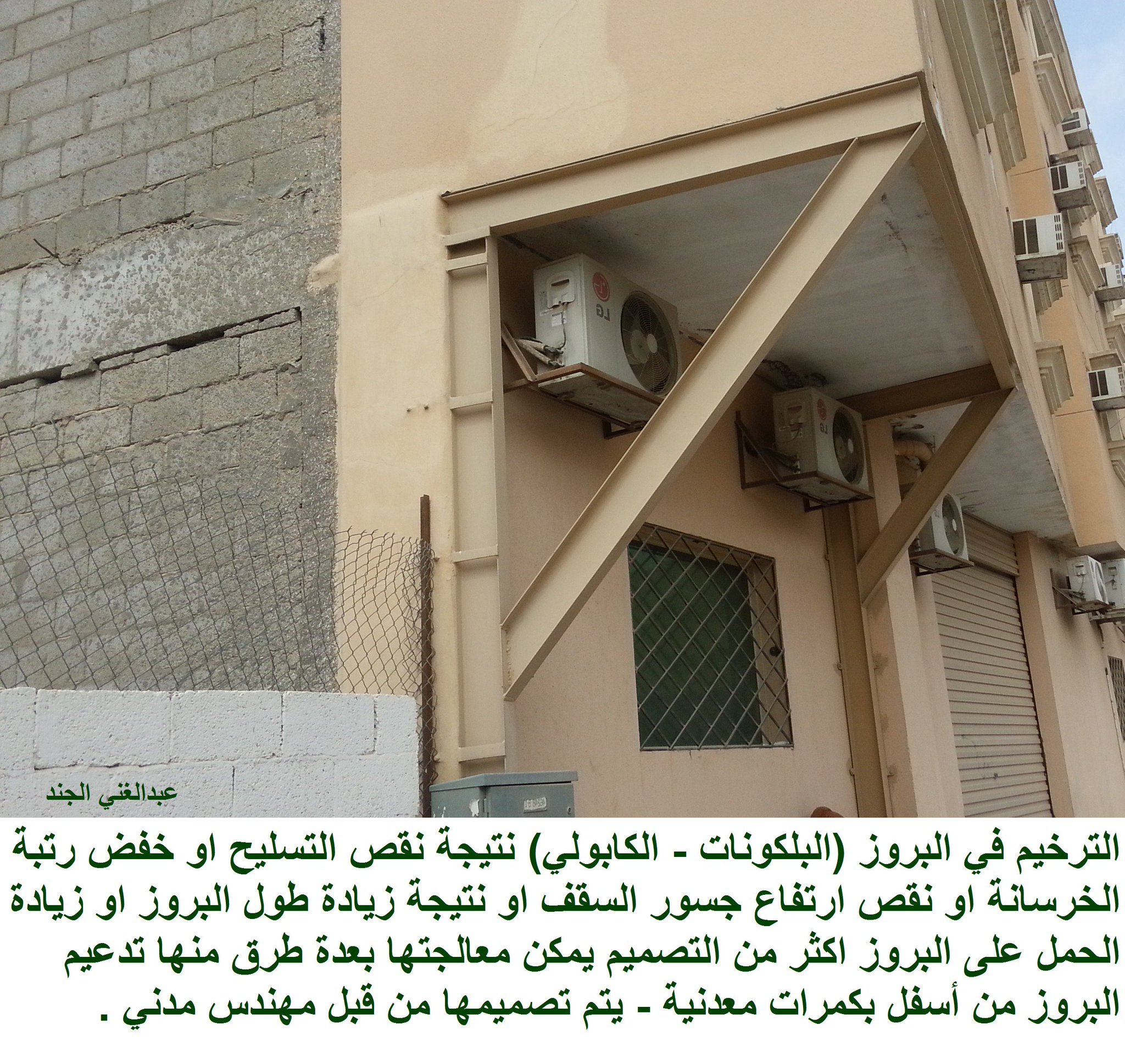 مهندس عبدالغني الجند Pa Twitter الترخيم في البروز البلكونات الكابولي نتيجة نقص التسليح او خفض رتبة الخرسانة او نقص ارتفاع جسور السقف او زيادة طول البروز او زيادة الحمل على البروز